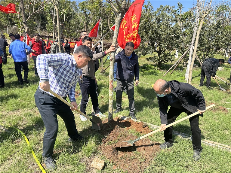 义务植树活动中,党员、志愿者、网格员等积极投身义务植树活动,以实际行动践行“绿色发展”理念,弘扬雷锋精神。只见他们冒着小雨挥锹铲土、定点挖坑、扶树培土、踩土夯苗,1个多小时后,溪前村口微景观公园新增了20多株成年香樟树、小叶榕,为溪前村再添一抹“新绿”。“植树添绿,绿化家园,是我们每个公民应尽的义务,更是一种社会美德,作为新时代文明实践者,我们要通过实际行动,带头参与植树活动,争做爱绿植绿护绿的宣传者、践行者、守护者。”参加义务植树活动的志愿者纷纷表示,今后将积极践行“绿水青山就是金山银山”理念,扎实做好生态文明建设工作。