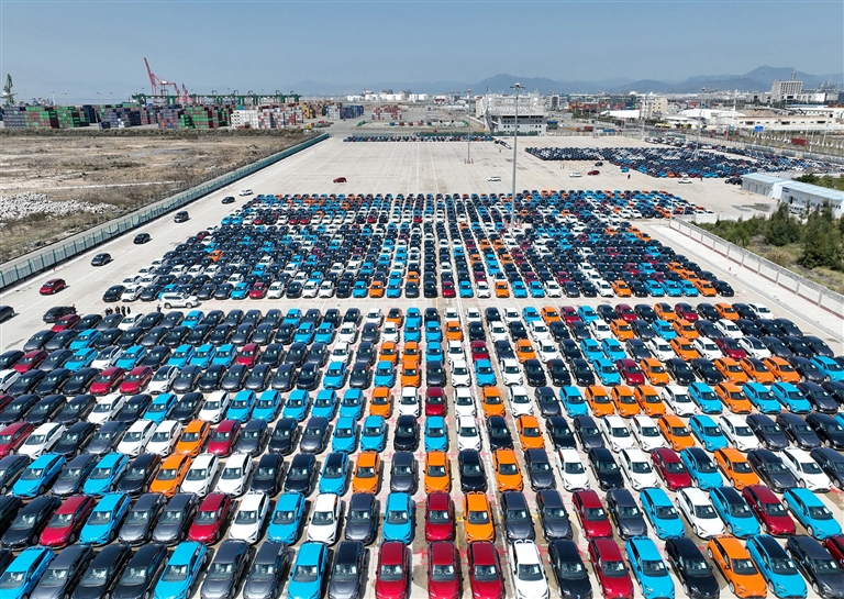3月12日,准备出口的车辆停靠在福州港江阴港区海关监管区,等待装船(无人机照片)。