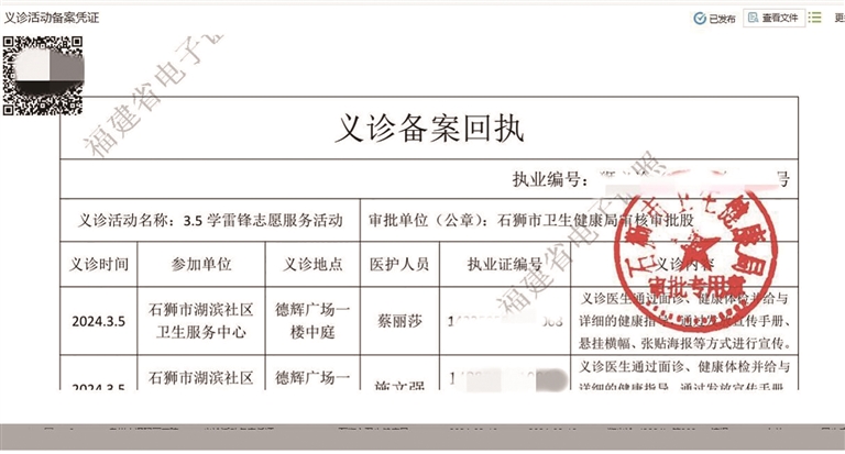 “在义诊活动开展前,我们会根据要求将材料通过‘掌上办’提交,卫健窗口工作人员审批通过后,就会发送一张‘义诊备案回执单’给我们。这样,义诊活动就可以顺利开展了。”办公室工作人员告诉记者,材料没问题的话,当天就能审批通过,速度很快。