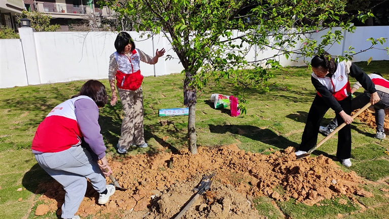 活动中,长福社区新时代文明实践站、“党建+”邻里中心与共建单位积极组织党员、志愿者参与。石狮一中附近一块新绿地,大家挥锹铲土、搬运树苗、扶苗踩实、填土浇水,分工明确,配合默契,以饱满的热情和干劲,认真完成植树的每一道工序。经过努力,十棵樱花树迎风挺立,为周边增添了一片新绿与生机。