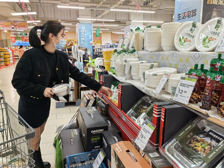 在宝岛路附近的一家商场展示台上,各式各样的露营用具摆放得整整齐齐,有8只装的一次性纸碗,60只装的一次性纸盘,还有纸杯、竹烧烤签以及便携式烧烤盘、烧烤架等等,吸引不少市民驻足选购。有的正在挑选适合家庭使用的烧烤架,有的则在比较不同品牌的一次性餐具。一位市民表示:“春天是露营的好时节,这个周末准备全家一起到学府公园露营,近距离感受春天的气息。”记者注意到,这些一次性纸质餐具价格普遍在25元以内,产品介绍的材质为甘蔗纸浆。查阅公开报道,甘蔗纸浆餐具因其无毒无害、易回收、可再生利用、可降解可堆肥等优点被称为环保餐具。不过,也有市民表示,“尽管纸质餐具安全环保,露营结束也要收集好,以免影响市容环境,尤其像竹烧烤签更不能随意丢弃。”