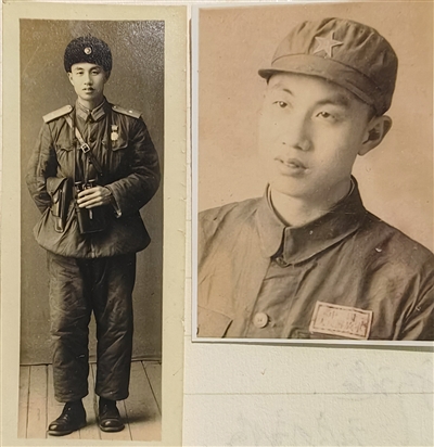 在这些证书资料中,施南辉首次发现父亲的戎装照。在其中一张照片中,施志明头戴55式棉帽(雷锋帽)、胸戴奖章、腰挎手枪、手持望远镜,显得英姿飒爽;另有一张是施志明与一群同学的合影,照片于1949年9月拍摄,照片背后写着“为纪念厦门解放”等字样。
