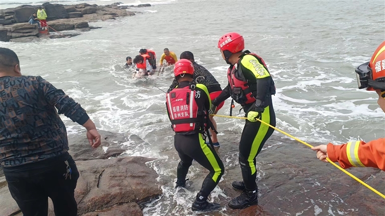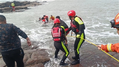 消防救援人员赶到现场时,正值海水涨潮高峰,海水逐渐将礁石淹没,消防救援人员穿好个人防护装备,配合海上救援队队员带上救助装备及救生筏游到对面礁石上,帮4名被困游客穿好防护装备后利用竹筏将他们带回岸边。据悉,4名游客从外地来到黄金海岸游玩,上礁石时未发现涨潮,待察觉后已经无法回到岸边,只好拨打119求助。