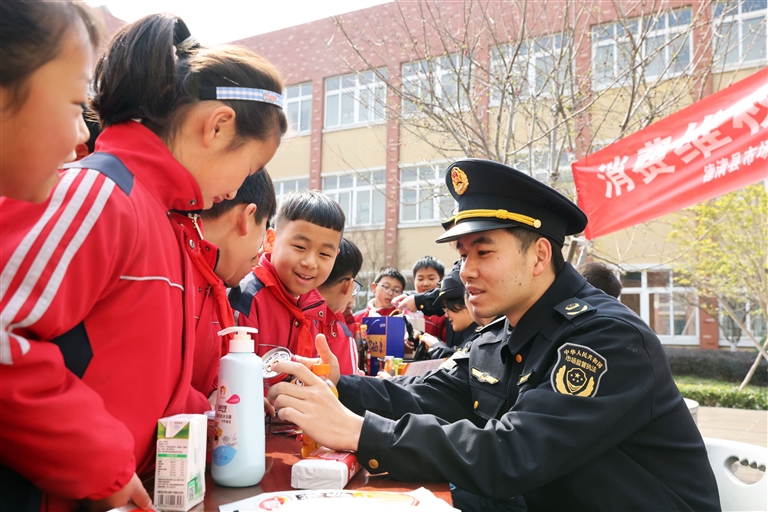 3月13日,在浙江省湖州市德清县乾元镇中心小学,市场监管执法人员向学生们传授如何辨识消费品。在3月15日国际消费者权益日即将到来之际,各地开展相关活动,维护消费者合法权益,提高人们的消费安全意识。(新华)