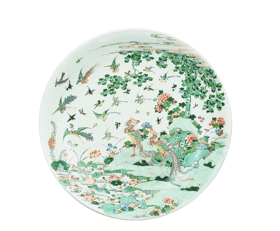 清康熙景德镇窑五彩百鸟朝凤图盘(见图),高9.6、口径55.4厘米。瓷盘上面描绘百鸟朝凤图案:一只凤凰站在山石上,栩栩如生;群鸟环绕着凤凰,四周衬以梧桐、牡丹、莲塘、彩云,将凤凰接受百鸟朝贺的威仪表现得淋漓尽致。瓷绘色彩大红大绿、对比强烈,但艳而不俗,华丽中见质朴。康熙五彩的大型器以民窑产品为多,这件百鸟朝凤盘亦属此类,款识、纹饰、题材、布局及底足皆具康熙器典型特征。