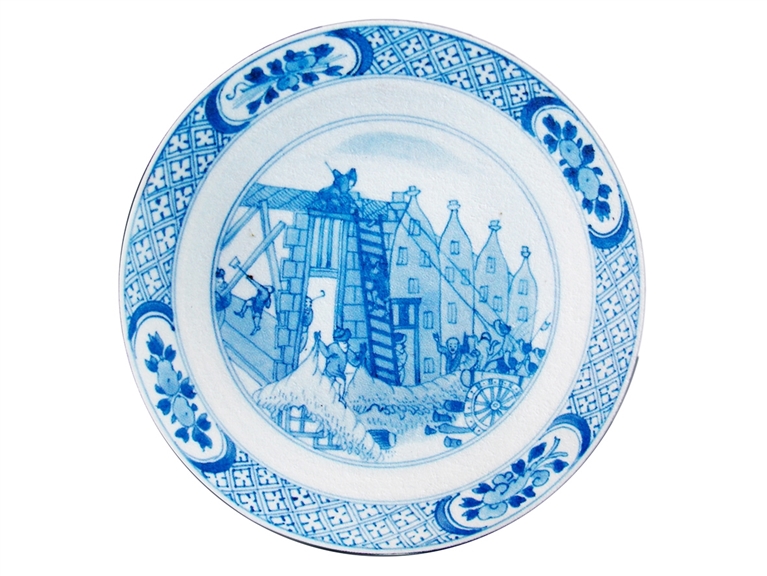 图1为康熙年青花盘,画面表现1690年的“鹿特丹起义”或称“考斯特曼起义”。说的是1690年8月发生在鹿特丹的一次事件。考斯特曼因拒绝缴纳不合理的货物税,而与蛮横无理的税吏发生肢体冲突,导致税吏死亡,结果考斯特曼被判处斩首。这事激怒了鹿特丹民众,他们发起暴动,推倒了法院大楼,抗议不公正的判决。图为愤怒的民众拆毁法院的情景,有的爬上房顶,有的在下面用绳子拉,有的抡起大锤砸墙。起义场景原本刻在金属器皿上,景德镇的画工可能是根据金属器皿的画意复制的。但也不是完全照搬,而是有了些改动,如房屋的数量、人物的行为和四周的建筑垃圾等,并加入一些中国元素。盘子的边饰绝对是中国风格,四组开窗内分别画着象征长寿和永久的桃子和灵芝。突发的政治事件画入瓷盘是十分少见的,为什么“鹿特丹起义”能绘入瓷盘,说明这起事件非同小可,而且民众希望这起事件成为永远的记忆。