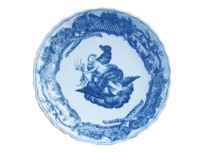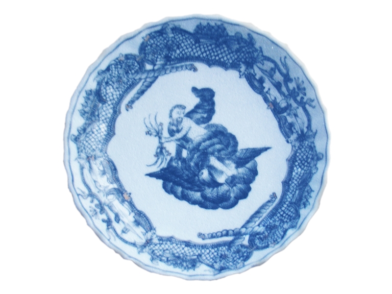 图2为乾隆年青花盘,盘中的人物为朱庇特即宙斯(Zeus):希腊神话中的主神,第三任神王;科洛诺斯和瑞亚之子,掌管天界。他以雷电为武器,维持着天地间的秩序,公牛和鹰是他的标志。他的兄弟波西顿和哈德斯分别掌管海洋和地狱;女神赫拉是宙斯的妻子。图为朱庇特坐在鹰背上,手持雷电在行使他的权力。边饰画着似龙非龙的动物,这大概是画工添上去的中国元素。