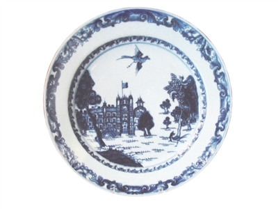 图5是乾隆年的青花大盘,画着一幢被称为伯利别墅的英国建筑,这是伊丽莎白一世时代的英国豪宅。画中虽然也有树木花草,但显然有点异国情调。有意思的是画中两只尾巴很长的鸟,一只在天上飞,另一只在地上觅食。这种鸟因尾羽长,形似绶带故名绶带鸟,又名寿带鸟、练鹊、一枝花。绶带鸟自古即被作为仁爱宽厚的象征,春秋师旷所著《禽经》上说:“冠鸟性勇,缨鸟性乐,带鸟性仁”,绶带鸟在这里就成为清代统治者的代言,因为它传达了乾隆皇帝“仁布天下”的思想。