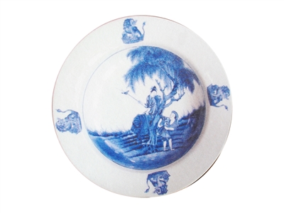 图6也是乾隆年的青花瓷盘,主图画着男女两人,女子骑在牛背上,手持竹子赶牛鞭,男子手牵牛绳,像是小两口在调笑,又像是两牧童在嬉戏。妙的是女子竹竿上歇着一只鸟,使画面陡然生动起来。盘子边上画着四只狮子,这是英国埃塞克斯郡迈克尔斯都托堂纳撒内尔·加兰的纹章,所谓纹章就是识别等级的一种规制。最初是在欧洲的战争中出现的,当盔甲盖住脸部时借以辨别敌我。后来被装饰在盾甲和旗帜上,超越了原本的意思。纹章的内容与色彩都有标准和规定,使用在纺织品、碑石以至描绘在瓷器上,成为某家族和团体的标记。瓷器上的纹章根据订烧者的要求绘制,因纹章为多种色彩,一般在粉彩、斗彩等瓷品上绘制,青花难以表现丰富的色彩,所以这只瓷盘上中国风俗画与英国纹章的组合就较为罕见。