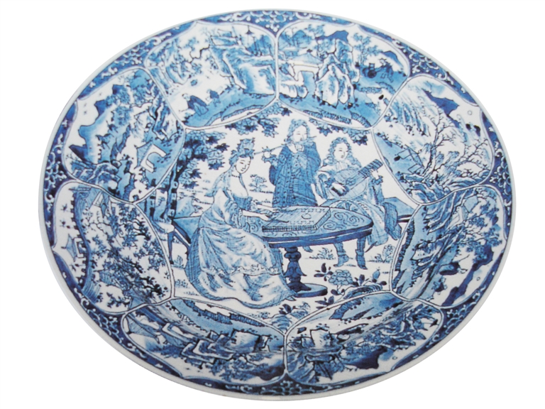 图7是康熙青花瓷盘,盘心绘西洋人物奏乐图,有穿着外国服饰、长着中国人脸的二男一女在演奏,两男子一吹长笛一弹琵琶,女的着长裙、弹扬琴。中国画师在表现洋人演奏的同时,不忘挥洒中国的山水人物,折沿处有扇形八开光描绘着典型的中国风俗:携琴访友、高士游赏、亭台楼阁、远山近水等。