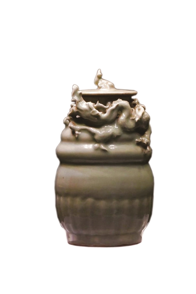 这是1959—1960年出土于龙泉市大窑窑址,现藏于温州市博物馆的“南宋龙泉窑青瓷堆塑龙纹瓶”(图1)。该瓶通高22.3、口径6.6、足径9.5厘米,直口、短颈、瓶身呈四重宝塔式,圈足,瓶肩颈部堆塑一条体态矫健的龙纹,龙前塑一火珠。下腹部刻仰莲瓣纹。瓶盖作平面式,俯卧鸟形钮,子母口。胎呈灰白色,质地坚硬致密,修胎精细。通体施粉青釉,釉色莹润、匀净。口沿与圈足足端露胎无釉,呈火石红色。