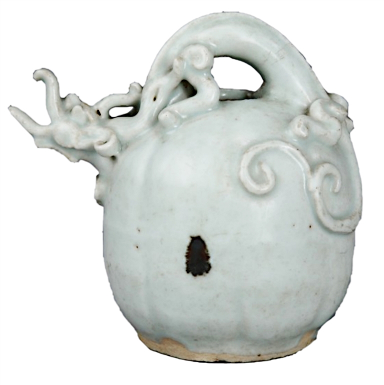 此为重庆中国三峡博物馆藏的“元影青釉瓜形铁锈斑龙柄提梁壶”(图2)。该壶高12.2、底径6.8厘米,1954年出土于重庆市沙坪坝区小龙坎元墓。小口,壶体呈瓜棱球形,平底。泥塑昂首龙头作流,龙颈贴于壶身,龙身卷曲作提梁,肢尾鼓凸并贴于壶的上部,呈飞腾状。通体施青白釉,釉色白中泛青,腹上有一处铁锈斑,底无釉。造型独特,设计巧妙,为元代瓷器中实用性和艺术性相结合的完美器物,被收入《中国美术全集》。