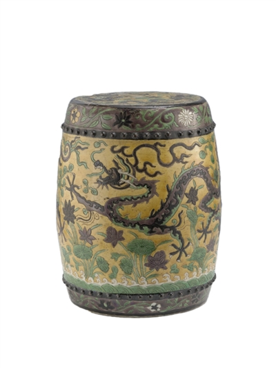 这是上海博物馆藏的“明万历景德镇窑黄地三彩双龙纹鼓凳绣墩”(图3),高33.8、底径23厘米。呈鼓式,中空,腹部上下各饰凸起鼓钉一周。座面绘双龙纹,腹部纹饰以紫色鼓钉为界分三层,上下绘卷草花卉纹,中部以黄釉为地,紫、绿彩绘双龙穿荷花纹饰。万历三彩色地多种多样,尤以黄釉为地的黄、绿、紫三彩为常见。此器造型敦厚、色调庄重,是万历三彩的代表器物之一。