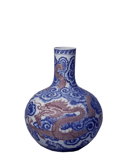 此为北京故宫博物院藏的“清乾隆青花釉里红云龙纹天球瓶”(图4),高47、口径10.7、足径15.5厘米。瓶直口、长颈、腹浑圆似球、圈足。内施白釉,外壁以青花、釉里红绘云龙出海。外底署青花篆体“大清乾隆年制”六字三行款。天球瓶是明永乐、宣德时期景德镇窑的创新器型,多以青花装饰。清代雍正、乾隆时期又烧造青花釉里红、斗彩、粉彩等品种。此瓶造型稳重端庄,是乾隆时期官窑瓷器中比较常见的器型。图案画法借鉴清代顺治时期经常使用的“龙身在云中三现”的表现形式,龙身只露出三段,其他部分被浮云遮掩,故称“一身三现”,确有“云从龙”之感。此种斑片云纹,顺治时最为流行,康熙时亦常用,到乾隆时期画面更加写实。