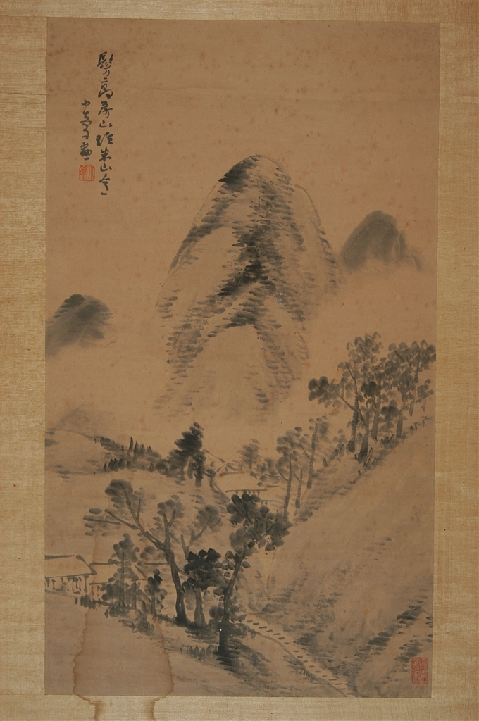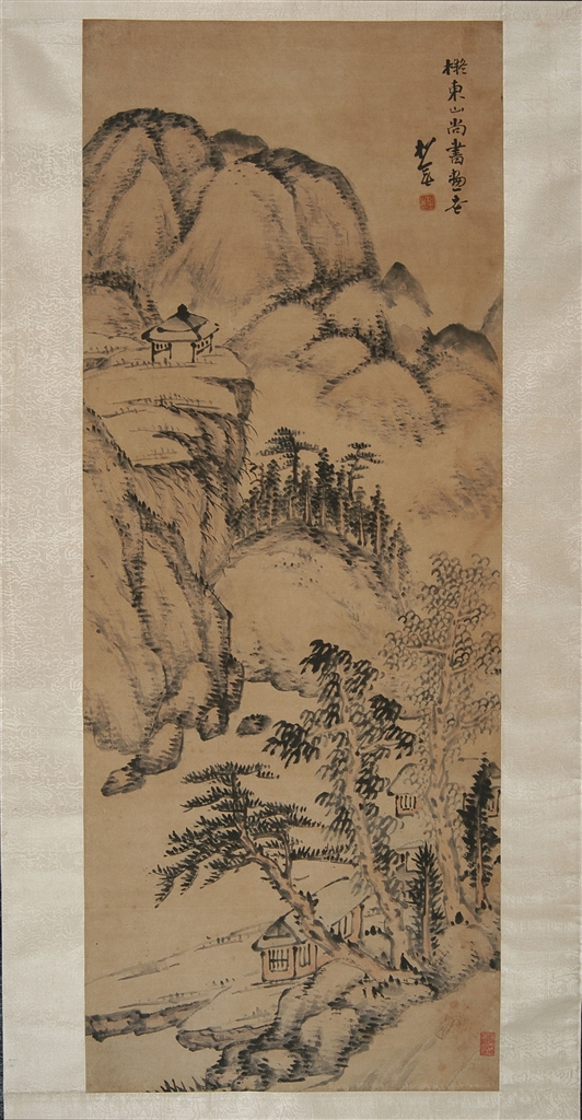 《水墨山水图》轴(图1)左上方款署:“仿高房山于半山作,小梦画”,下有一朱文印“小梦”。作者以皴擦手法绘山石脉络,简笔淡画其轮廓,显得巍峨高峻。近处以浓墨勾勒树干,浅墨点晕林片,整个山林枝繁叶茂、郁郁葱葱。隐约中,一条潺潺的小河从山间流过,几座小屋隐现其中。整幅画面结构工稳而有古气,用笔爽利挺劲,在清寂之外具有一种清朗澄净之美。