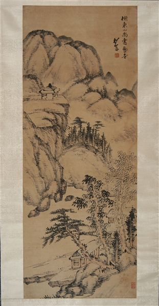 《淡彩山水图》轴(图2)右上方题为“摹东山尚书画花”,落款“松年”,款下有白文姓名印一方“松年之印”。作者仿清代官员、书画名家董邦达画法,用笔虚实相间,枯笔短皴,笔法浑厚。画中山石多以披麻画之,皴擦点染,然后用披麻皴法皴染,干笔淡墨勾出山石的结构。画面近景几株松柏挺拔耸立于下面的石坡上,后面几间屋舍门窗紧闭,潺潺小溪弯弯曲曲萦绕在坡石水草中。山顶几处远山用淡墨烘染,空蒙清虚,云气弥散。整幅作品画面气势宏阔、意趣高古,虽只用了赭石、水墨烘染,却呈现出一种虚实相间静谧古穆的气息。