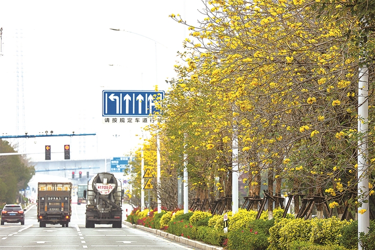 春暖花开万物苏,石狮大道水头村段两旁的黄花风铃木也已经繁花似锦。3月15日,记者在该路段看到,两旁的黄花风铃一路盛开,一朵朵黄色花朵挂上枝头,亮眼的黄色没有一点杂质,成为石狮大道上的一道亮丽风景。(记者 颜华杰)