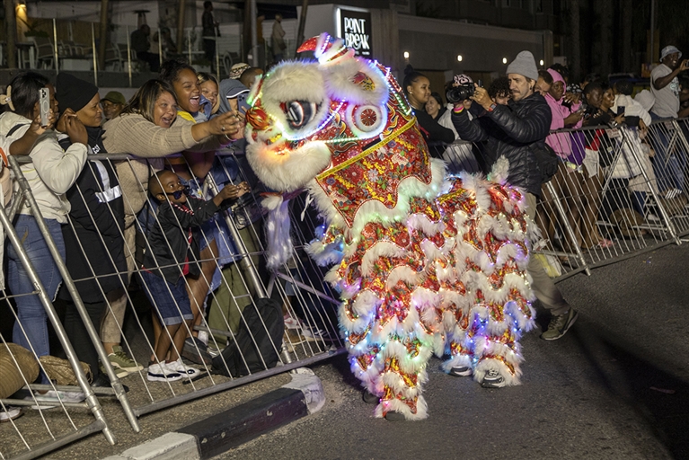 中国方阵的舞狮表演者在开普敦狂欢节游行中与观众互动