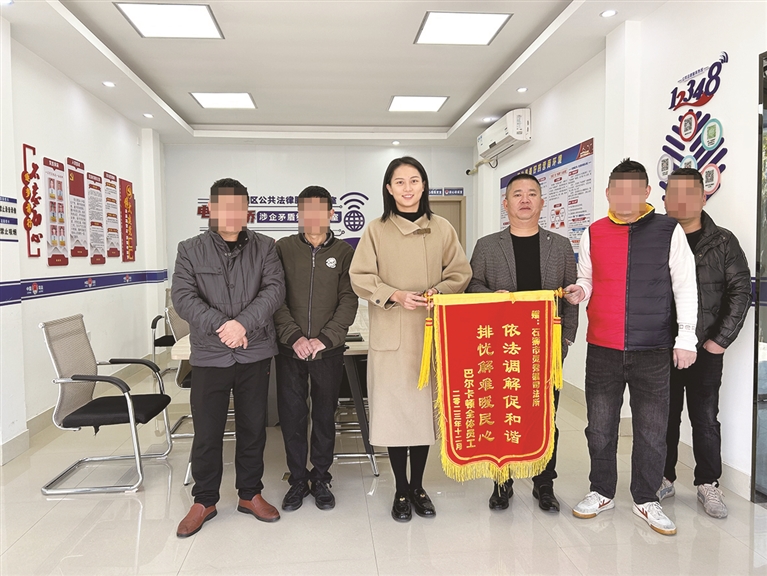 2023年12月底,灵秀镇综治中心和灵秀司法所收到了一面锦旗,这是辖区前廊村一服装生产企业的31名员工联合送来的。“依法调解促和谐 排忧解难暖民心”14个金色字体背后,是新揭牌成立不久的灵秀镇综治中心急群众所急、解群众所难,通过耐心调解,帮工人们拿到了近40万元的拖欠工资,让这起劳资纠纷画上了圆满句号。