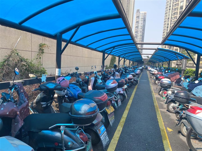 值得一提的是,在挨着正荣府小区的鼎盛天玺小区,几个地下室出入口这几天也新装了一道道闸,入口旁的花圃内则竖立着一块醒目的提醒标牌:禁止电动车、摩托车进入地下室。隔着一条区间小道,贴着小区围墙处,此前已先期规划有电动车停车位和充电桩。“金海花园城小区也在跟进,目前正在寻找合适的位置。”蔡建榕介绍。