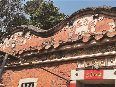除此外,泥塑、剪瓷、木雕、石雕等工艺在古厝的山墙、屋檐、厅内、墙体上随处可见。更引人注目的是房屋的右侧墙体采用剪瓷工艺制作了4个别样的大花瓶,至今依然清晰可见。