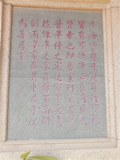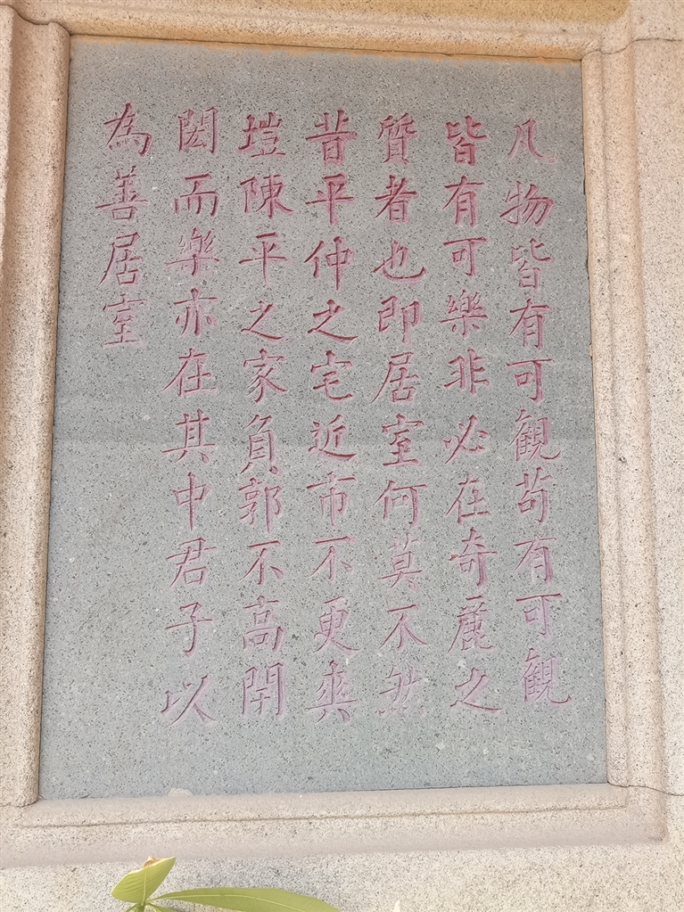 “凡物皆有可观,苟有可观,皆有可乐,非必怪奇伟丽者也……君子以为善居室。”这是镌刻在龙穴村高染大厝门牌楼面左侧的一段话。“凡物皆有可观,苟有可观,皆有可乐,非必怪奇伟丽者也”这句话出自苏轼的《超然台记》,意思是任何事物都有可观赏的地方。如有可观赏的地方,那么都可使人快乐,不必一定是怪异、新奇、雄伟、瑰丽的景观。这段话是告诉后代子孙,凡物不要追求新奇、瑰丽,关键是人要从善。