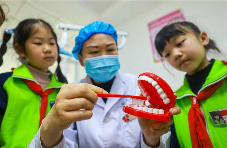 3月19日,在山东省荣成市妇幼保健院儿童牙科,医护人员为小学生讲解口腔健康知识。世界口腔健康日将至,各地开展口腔健康主题活动,倡导人们养成良好口腔卫生习惯,预防口腔疾病。(新华)