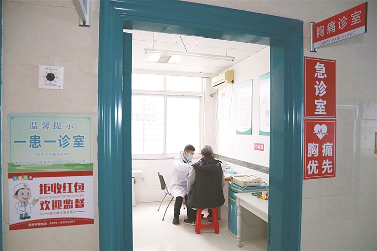自2022年12月起,中心启动胸痛救治单元建设,完善院内科室、设备、标识、诊疗流程,并与石狮市总医院建立联合救治转诊体系,形成信息共享、上下联动、无缝对接的救治格局,为胸痛患者打通生命的“绿色通道”。同时,中心在辖区每个村选一家卫生所(室)进行胸痛救治网点建设,加强村医培训,向胸痛救治网络全域覆盖迈出了坚实的一步。在社会企业家的热心捐赠下,共有13个村卫生所(室)配备了心电图机,能够与石狮市总医院心电诊断中心互联,及时传输,提高对胸痛患者的及时诊断救治能力。