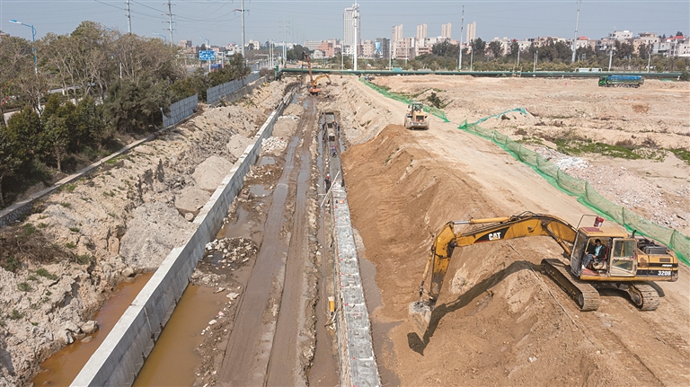 本报讯 3月19日,记者在施工现场看到,在挖掘机、打桩机、罐车等各类机械车辆的配合下,工人们正有序进行大厦溪挡土墙的施工作业以及墙背的土方回填。“已经完成50%的工程量,目前主要在做大厦溪的挡土墙施工,这部分已经完成40%,预计今年7月份挡土墙这一块可以全部完工。”现场相关负责人介绍道。