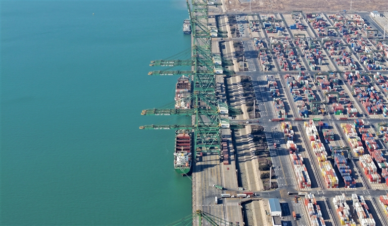 3月20日,货轮靠泊在天津港北航道内的泊位中(无人机照片)。 日前,天津海事局发布航行通告公布天津港北航道通航参数,这标志着天津港20万吨级北航道正式开通,天津港集装箱船舶实载率得到有效提升。天津港北航道是天津港区域集装箱船舶进出的主要通道之一,是新港航道与北疆、东疆各集装箱码头公司间的水上通路。(新华)