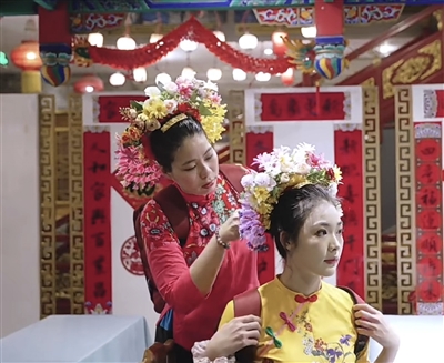 在现场,不少观众在福建姑娘的手下,成为簪着花环的美丽姑娘。少林武僧的表演,引得人群中爆发出阵阵欢呼声和掌声。猪八戒、兔子等造型的提线木偶憨态可掬,吸引观众驻足拍照。