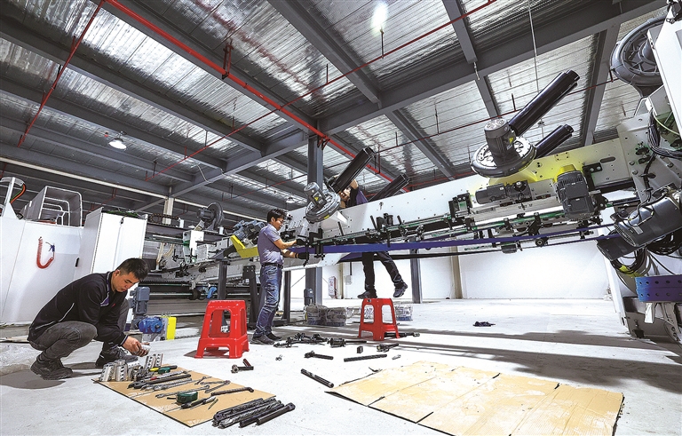 本报讯 3月20日上午,记者在位于我市祥蚶新材料产业园区的泉州市百丰环保科技有限公司看到,该公司智能环保包装制品项目“纸箱联动生产线”“瓦楞纸板生产线”进入设备安装阶段。崭新的标准厂房内,数名设备安装技术人员正争分夺秒埋头苦干,加紧安装印刷开槽横切机等符合国家环保标准的各种智能机台设备,预计4月底5月初将全面调试完成。