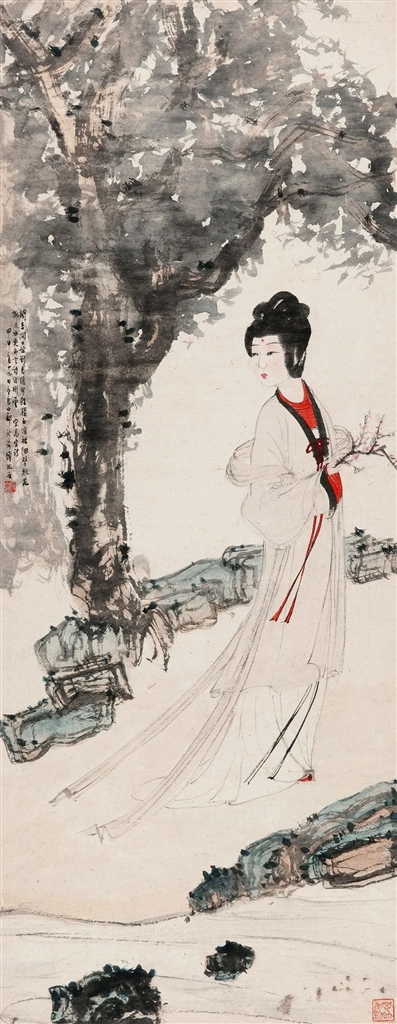 2012年北京保利春拍中,傅抱石1944年作《细擘桃花掷流水》,以918.4万元成交。作品长105、宽40厘米。画面描绘的是傅抱石笔下诸多美人之一,轻纱曼舞,朱唇微开。人物造型源于唐俑与陈老莲,体形颀硕丰盈,开相古朴,聪慧有灵性,衣带渐宽,飘逸飞动。木叶飘零,片片落下,由远及近,自上而下。顿觉秋风袅袅、烟波浩渺的孤寂之感。是帧以宋高宗赵构著诗为题识,原诗上句:“闲来洞口访刘君,缓步轻抬玉线裙。”引出一位婀娜女子,斜倚梧桐,遥寄幽思;原诗下句:“细擘桃花掷流水,更无言语倚彤云。”回眸时,但见她黛眉重锁,手掷桃枝,欲语还休,颇有“折得桃花独自看”之意。