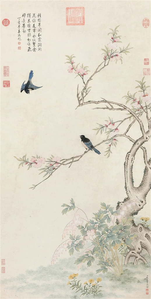 2011年的北京保利秋拍会上,由清乾隆时期画家杨大章绘就的《碧桃翠雀》图立轴,拍前估价1500万—2000万元,最终收获2817.5万元成交价,引发瞩目。此作品长128、宽64厘米,左上角有乾隆御题诗“种树早闻和露润,开花偏是带冰纹。翠禽择木栖方稳,相唤飞明意甚勤。”诗题的时间是丁亥季春,即1767年,时乾隆帝57岁。画面中,一株桃树从画面右下角伸入画面,满树桃花盛开,繁花密蕊。两只翠禽,一只伫立枝头,一只飞翔于空中,顾盼鸣叫。鲜花野卉丛生于下。桃树分枝布叶,枝顺条畅,挥洒自如。树干、桃花淡墨勾勒,略施渲染,桃叶及树下鲜花野卉则用没骨画法。两只翠禽使用矿物质的重色,精勾细染。作品构图以桃树“S”形的枝干摆布,画面丰富饱满中寓俊逸空灵。整幅作品造型工整,设色明快,深浅适度,晕染滋润,墨彩雅澹。禽鸟的重色与淡雅的桃花、野卉以及地面上的苔草形成鲜明的色彩对比,冷隽明丽的格调中又透露出一丝雍容富贵的韵味。