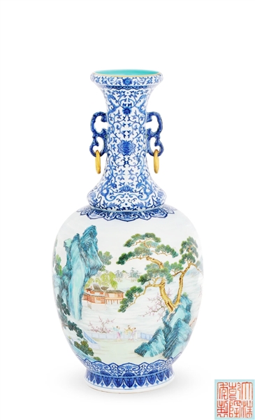 器身以彩料细绘“桃花源”通景图,若以手卷论,则图画伊始处有巍峨巨石呈拱门状立于潺潺江水之中,码头上空无一人一物,似点名此处为遗世之境。稍稍转动瓶身,桃源之景映入眼帘:岸上人物衣袖色泽鲜艳,立于桃花绿柳及松柏之间,或游船、或对饮、或遥指远处亭台楼阁品评湖光山色,意趣高雅。远处的重峦叠嶂与茫茫青翠之中,间或有小屋藏于其中,真正是“土地平旷,屋舍俨然,有良田美池桑竹之属”。这一派祥和之景,又都笼罩于以淡蓝彩轻抹于上的霭霭云气之下,如梦似幻。(记者 王国良)