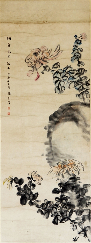 梅兰芳《菊花》立轴(见图),纸本,纵85、横32厘米,现收藏于昌邑市博物馆。