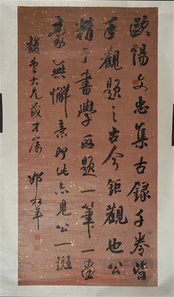 新乡市博物馆收藏有一幅清代邵松年行书条轴(见图)。作品纸本,纵125、横64厘米,为二级品。书法内容为:“欧阳文忠集古录千卷,皆手观题之古今巨观也。公精于书学,所题一笔一画,毫无懈意,即此亦见公一斑”,出自清代孙承泽所著《庚子销夏记》中对北宋大文学家欧阳修的书法艺术评价。左侧有题款:“馥堂大兄茂才属,邵松年”,款下有钤印两方:上方为“邵松年印”白文方印,下方为“癸未翰林”朱文方印。