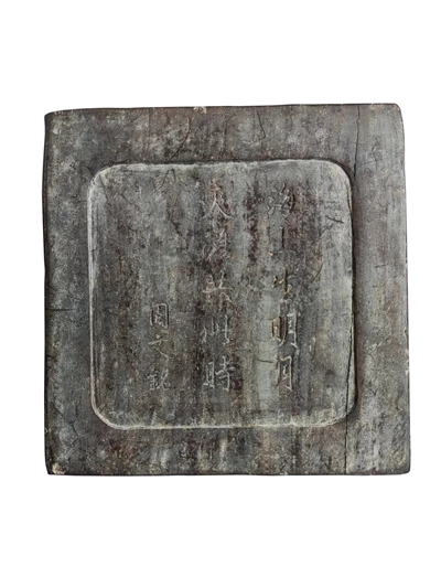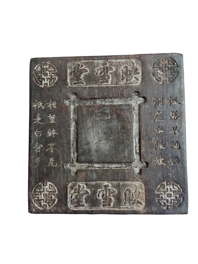 清代“映雪堂”款四方形檀木砚(图1),边长18、厚3.8厘米。木砚正面中央雕刻井字形方砚堂。砚堂上下对齐阳刻“映雪堂”三个行书字。砚堂左右侧阴刻清代诗人宋乐一首诗:右侧为“枫落早鸿过,洞庭无限波”,左侧为“相望终不见,只是白云多”,砚正面四角各阳刻一个篆体“寿”字。木砚底部四方形凹部分阴刻唐代诗人张九龄《望月怀远》诗句及刻者名款:“海上生明月,天涯共此时。周文铭。”映雪堂是传承悠久的名堂号。东晋时期,孙康家贫,夜读无烛,乃出庭坐于雪地映雪读书,后来成为大学问者,官至御史大夫,实现抱负,成为世人发愤读书的典范和楷模。孙康后人因此以“映雪”为堂号,堂联为:“掷金绵世泽,映雪振家声。”现传承二十世,映雪堂名人辈出,古有孙思邈,今有孙中山。