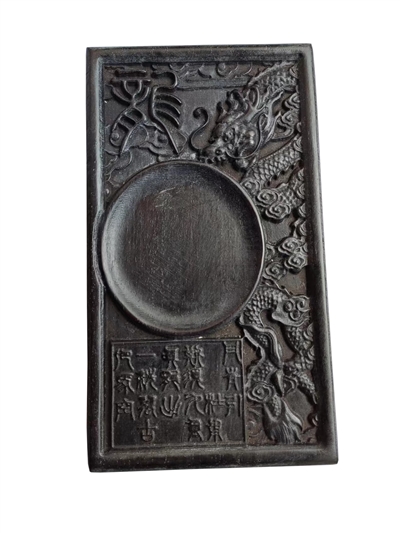 清代“龙”字款长方形檀木砚(图2),长23、宽13、厚2.1厘米。木砚正面中央靠左有一圆形砚堂,砚堂上方与右侧高浮雕一条龙,龙头左边阳刻一个篆体“龙”字,龙字底下祥云朵朵,活像一条飞升的真龙。砚堂左下方长方形框内阳刻杜甫《丹青引赠曹将军霸》诗句:“斯须九重真龙出,一洗万古凡马空。”