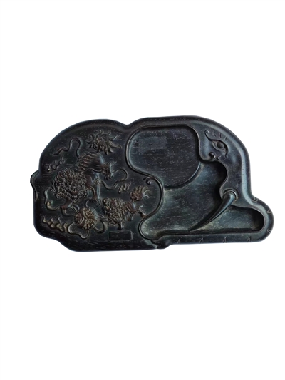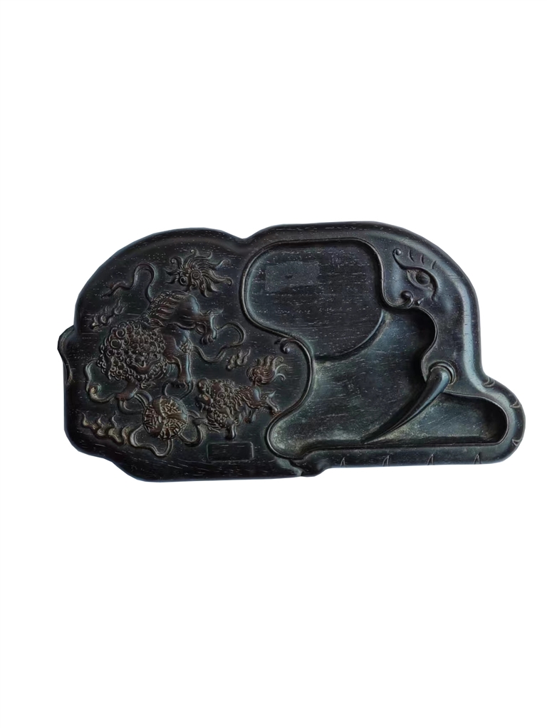 清代象形檀木砚(图4),长20.5、宽11.5、厚1.8厘米。砚面似一只躺着的大象,以象耳与张开的象嘴及象牙作砚堂,共分三层,象耳浅雕为上层砚堂,象嘴与象牙深雕为中下层砚堂,以象牙巧妙作自然分隔层。既可磨墨,又可作笔掭,还可作小水盂。砚堂右侧雕刻象眼、象牙和象鼻,活灵活现。砚堂左侧象身体后部分阳雕太狮和少狮戏绣球场景。砚的最后侧还雕有一条极富动感的象尾巴,让整件作品尽显灵动。