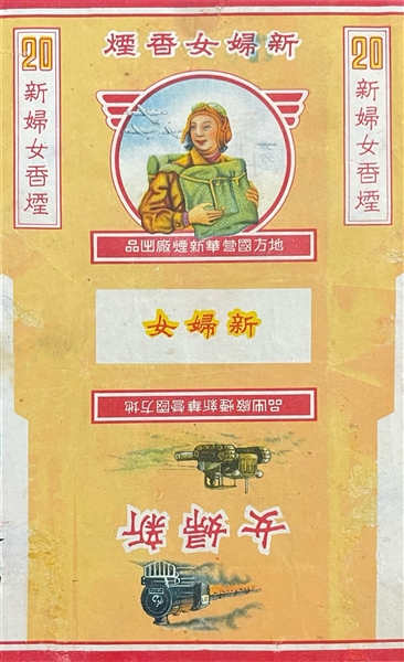 国产烟标也不乏飒爽英姿的女兵形象。如湖北省国营大达烟厂出品于20世纪50年代的“女将军”烟标(图11),主版凸显出一名身着戎装的女将军手握钢枪、站岗放哨巡视的画面。地方国营华新烟厂出品于同期的“新妇女”烟标(图12),主版在编组飞机冲向蓝天白云的背景映衬下,突出表现了新中国第一代女飞行员身着飞行装备整装待发的形象,副版分别再现了新中国第一代女拖拉机司机、火车司机,驾驶着拖拉机、火车,行进于田野耕地、铁道的形象。这几幅简约明快的画面,完美诠释了新中国第一代女飞行员、女拖拉机司机、女火车司机,同其他战线上的新中国妇女一样,在蒸蒸日上、日新月异的祖国各项建设事业中彪炳史册,功不可没。