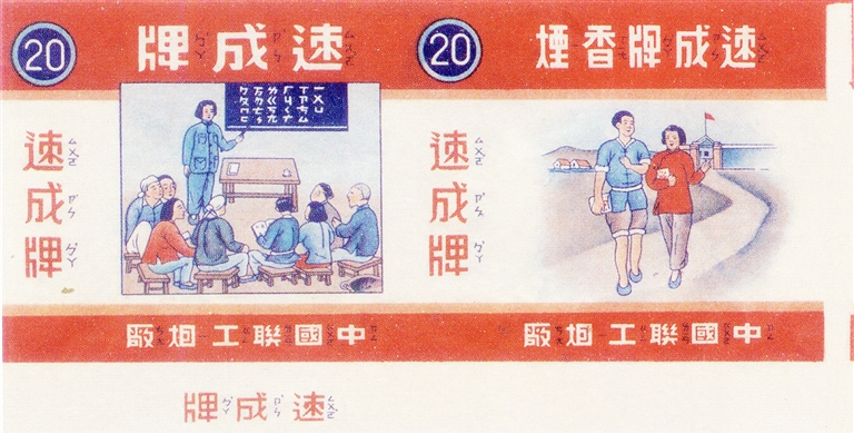 除了上述几枚烟标,问世于20世纪50年代的国产烟标,更多地把镜头聚焦在战斗于各条一线工作岗位的中国妇女。如新华烟厂出品的“革新牌”烟标(图5),主版为一名青年女工的写真:只见她正在有书籍和圆规的工作台前,面对自己设计出的一张机器零部件草图,似乎在考虑这个零部件对于技术革新,是否能起到较大的关键性改进。中国联工烟厂出品的“速成牌”烟标(图6),主版是一名教师手持教鞭指着板书,向围坐在一起聚精会神听讲的农民学员讲授注音字母识别要领。烟标上这些注音字母,由二十四个声母和十六个韵母组成,又称国音字母、注音符号、注音字符,是我国第一套法定的用来标注汉字字音的音标。1913年由读音统一会制定,1918年北洋教育部公布的这套注音字母方案,对统一汉字读音、推广国语、普及拼音知识作出了很大的贡献,1958年《汉语拼音方案》公布后完成其历史使命。