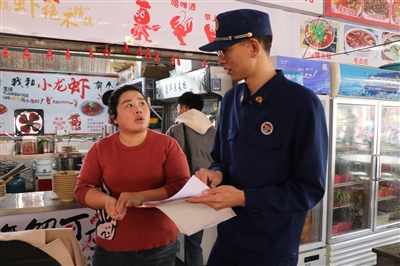 “您好,大姐,这个灭火器不能隐藏起来,不要被杂物遮挡,要放在显眼的位置。”宣讲人员采用边检查、边指导、边宣传的方式,全面深入排查“九小场所”安全隐患,指导隐患整改,提升商户的消防安全意识。同时重点针对各店铺用火用电用油用气、建筑防火分隔、安全疏散及人员住宿、疏散通道是否堆放杂物、消防设施器材是否完好可正常使用等情况进行排查。活动期间,宣讲人员结合“九小场所”消防安全整治通用标准“八个必须”要求,指导各商户如何查找火灾隐患以及消防设施器材的日常检查和使用,提醒各商户经常性开展消防安全隐患自查,杜绝麻痹大意的思想,把火灾事故扼杀在摇篮里。