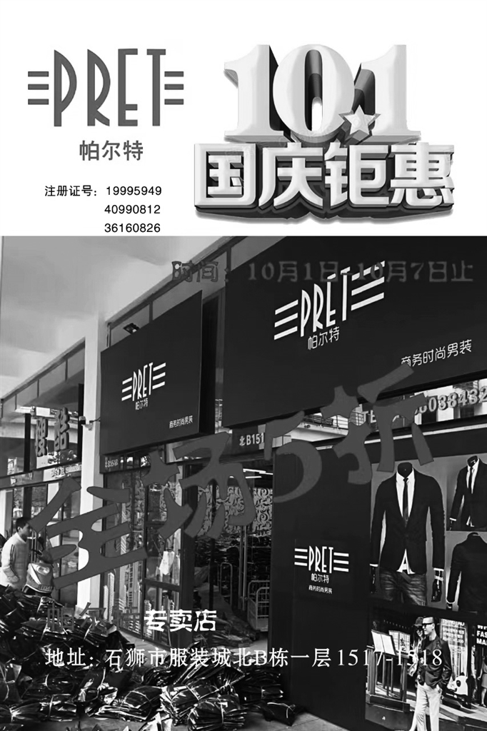 注册证号: 本店急招男装导购2名! 有意者可到店面谈! 19995949 40990812 36160826 地址:石狮市服装城北B栋一层1517-1518