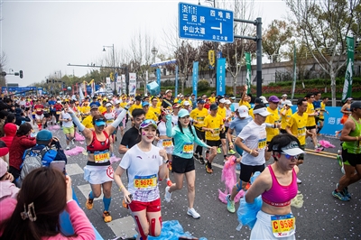 3月24日,参赛选手在比赛中。当日,2024武汉马拉松鸣枪开跑。赛事吸引来自全球38个国家和地区的26万余人报名,经抽签,共有3万人获得参赛资格。(新华)