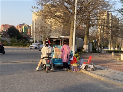 近日,笔者在宋塘路和石北路交叉路口看到有商贩将车停在路边售卖水果,盛放水果的筐子堆在路边,筐内的果皮撒落一地,给周围卫生环境带来影响。占道经营一直是市民关注的城市管理话题,部分商贩为图一时方便,擅自在人行道、非机动车道上设摊占道摆卖,既影响市容市貌,又容易造成道路拥堵,存在一定的交通安全隐患。(张诗瑶)