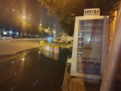 在翠湖明珠花园小区靠宝岛路一侧,笔者看到门前污水汇聚的区域已经被围起来,市政污水雨水分开管道正在施工。一处井盖冒出污水,流到路面及盲道、人行道上,影响正常通行。在宝岛花园小区靠福辉路一侧,小区门前也是一片污水。根据市民提供的3月23日夜间拍摄的图片,污水横流的状况比笔者现场观察的更严重。