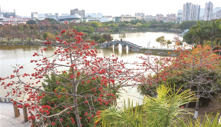 本报讯 三月春暖花开,又到了木棉花盛开的季节,3月27日,龟湖公园内的木棉树红花挂满枝头,橘红色的花瓣如火苗一样蹿出,格外耀眼,为城市带来了春天的气息。(记者 颜华杰)