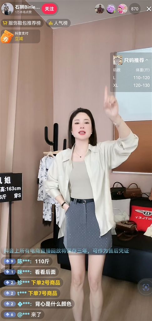不久前,头部主播辛巴辛有志“2024年首场直播”的成绩十分亮眼:带货近200款产品中超半数以上女性为消费主力,而该场累计引导销售额超5亿元。众所周知,女性是消费主力,在辛选直播间也是如此。而这一“她经济”热潮的同时,石狮女装品牌在直播间也以独特风格快速出圈,跑出了“石狮加速度”。“姐妹们、宝贝们,建议卡其色短裙搭配5号优雅性感衬衫,尽显女性魅力”“宝贝们,相信主播,或者到我们主页面,不仅有产品介绍,更有搭配穿搭的视频,相信不少宝贝能从中找到灵感”……