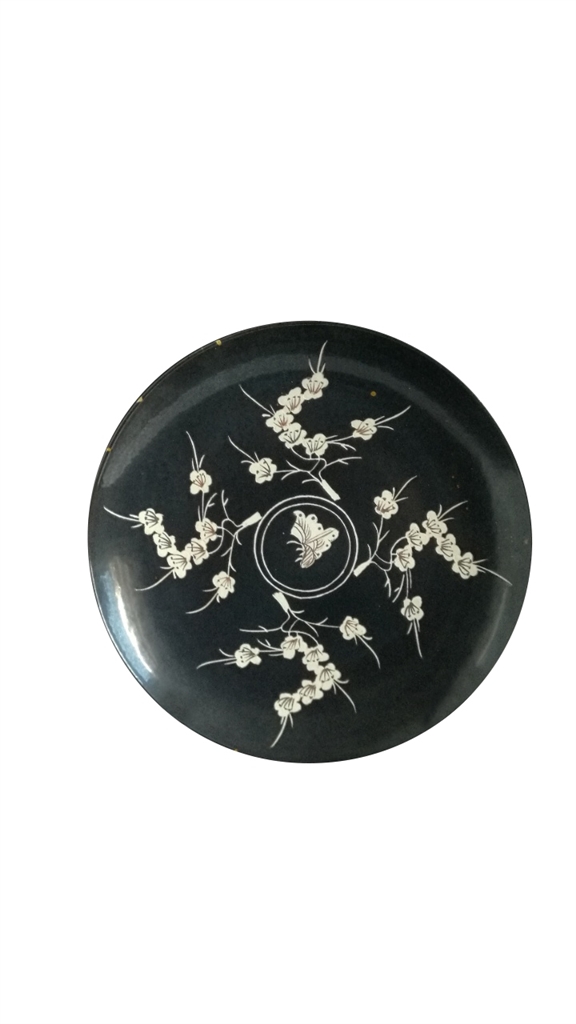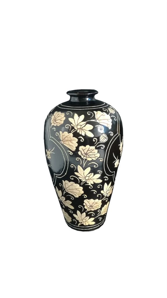 关于宋代吉州窑产品的装饰手法,在中国陶瓷史上有着浓墨重彩的记述,如剪纸漏花、木叶贴、玳瑁釉、立粉线描、模印鱼纹、刻划纹等。这件黑釉剔刻枝梅纹大盘(图1),器物上黑白对比,色调的反差凸显出梅花的静穆与端庄,清新雅丽,耐人寻味。这件黑釉剔花梅瓶(图2)的装饰手法,首先将梅瓶素胎满上黑釉,待干后用刀具在釉面剔刻掉纹饰内的黑釉,以胎色显出莲花、莲叶、莲蓬,还巧妙地剔刻出海棠花形开光内一枝梅花,再以浅褐色颜料在胎上勾画出叶脉和花瓣纹、梅枝纹,画面显得韵味盎然。
